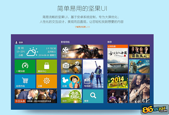 在功能方面,坚果G1搭载了基于Android 深度研发的坚果智能操作系统,有了这个智能系统做支持,用户可以随意的对坚果G1的功能进行扩展。只要有相应的应用软件作为支持,坚果G1就可以化身为任何家庭娱乐设备,如智能KTV、游戏机、超级电视等等,让用户玩转客厅娱乐生活。