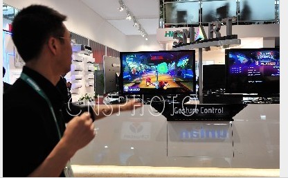 4月15日上午,第109届广交会开幕,一名家电企业员工在智能电视前挥拳,演示体感游戏功能。