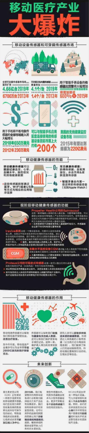 美国无线健康监控设备市场有望在今年达到220亿美元的规模。全世界移动设备传感器市场的收入也会出现增长。2012年,移动设备传感器全球市场的收入为23亿美元。2018年,这一数据将增长到65亿美元。