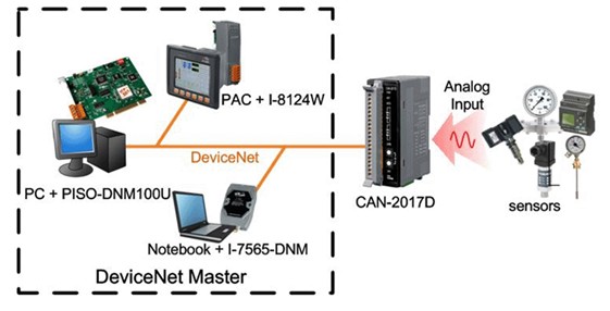 CAN-2017D遵循DeviceNet规范(Volume I/II, Release 2.0)。用户可以通过标准的DeviceNet协议获得模拟量输入数据与模块的配置。建立DeviceNet主站与CAN-2017D间的通讯,不再是一个艰难的项目。DeviceNet的电子数据表(EDS)将可以快速且轻松地帮助使用者达到此目的。CAN-2017D模块拥有8组模拟量输入通道,可用来量测电压与电流。使得它可以适用于各种应用。藉由泓格科技公司的DeviceNet主站,使用者可以简单地建构一个DeviceNet网络以满足他们的需求。
