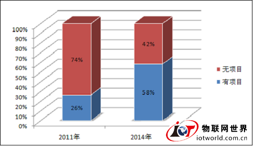 从2011年、2014年城市智能交通项目综合覆盖率对比结果看,2014年有城市智能交通项目投资的城市较2011年翻一倍,智能交通建设需求迅速增加,但仍有42%的城市仍处于待开发建设状态。