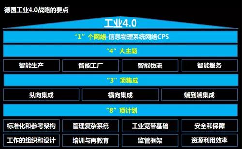 德国政府所定义的德国工业4.0,由一个信息,一个网络,四大主题、三项集成、八项计划组成的框架机构。德国政府提出工业4.0整体框架有很多地方和中国的实际国情不同,操作上面还有一定的距离。