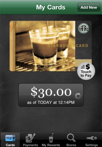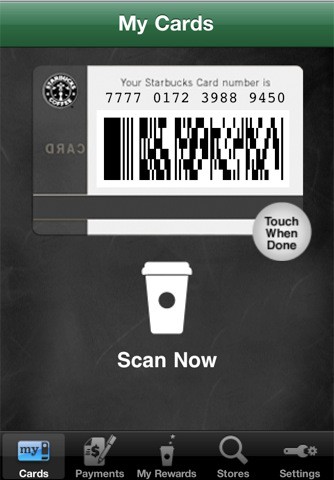 星巴克卡移动应用可以让消费者在移动设备上通过Paypal或信用卡,添加他们的星巴克卡,并跟踪奖励或重置卡片。用手机支付,消费者只需简单的选择“触摸支付”(Touch to pay),并用门店现金出纳机上的2D扫描仪扫描手机屏幕上的条形码即可。