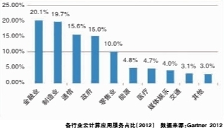 云计算在工业领域有着广阔的应用前景。工业云是通过云计算技术为工业企业提供服务,使工业企业的社会资源实现共享的一种信息化创新模式,是云计算在工业领域的典型应用。据Gartner数据统计,制造业中云计算应用的渗透率仅次于金融业,达19.7%(见下图)。