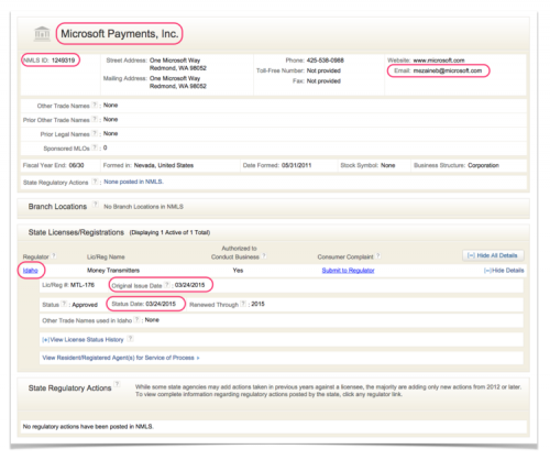 科汗还曝光了一张美国爱达荷州(Idaho)批准微软在该州开展支付业务的文件截图,图片显示申请货币转移牌照(Money Transmitter License)的主体是“微软支付”(Microsoft Payment, Inc.),获批时间为2015年3月24日。