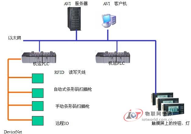 AVI系统与AB ControlLogix L61/L62 PLC通信,RFID天线、条码扫描枪、AVI操作员站之间是通过现场总线DeviceNet通讯;机运个区PLC、操作站触摸屏与AVI服务器、AVI客户端之间都通过以太网通讯。