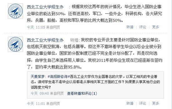 西北工业大学招办与网友进行微博互动