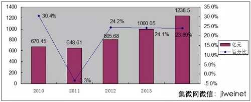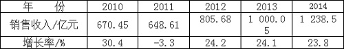 根据中国半导体封装协会统计数据,2014年国内IC封装测试业发展稍强于整个集成电路产业,封装测试业销售收入由2013年的1000.05亿元增至1238.5亿元,同比增长23.8%。近5年国内IC封装测试业销售收入及增长情况见表1及图2。