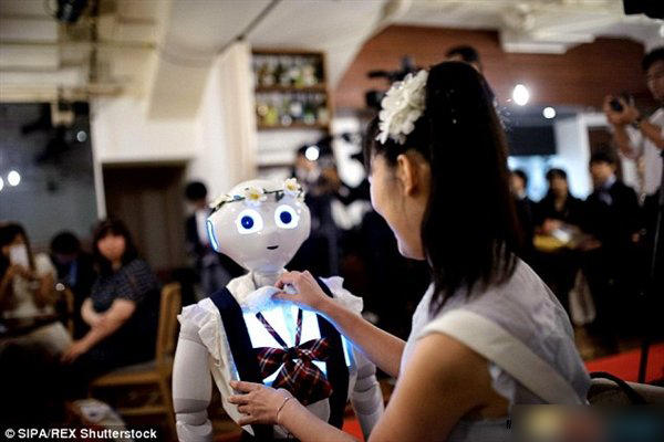 29日,日本上演了史上头一回机器人婚礼——“新郎”佛利斯和“新娘”约克琳,在日本完婚了,这是全世界第一起的机器人婚礼,仪式按照一般的婚礼方式及程序进行,“新娘”穿着白色婚纱进场、以“新郎”拥吻“新娘”做结,当天现场气氛相当热闹与特别。