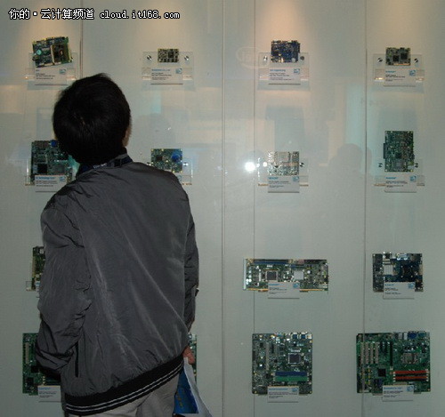 ▲嵌入式板卡大荟萃(这哥们看得太入迷了,一直不走...),这些板卡大多是基于英特尔酷睿或凌动处理器的。