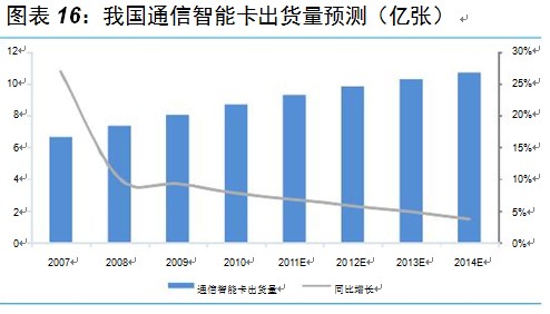 近年来我国通信智能卡发卡量一直保持稳定增长,未来受移动用户持续增长和3G业务发展等因素的驱动,我国通信智能卡市场保持6%左右的小幅增长,至2014年年出货量有望达到10.7亿张。