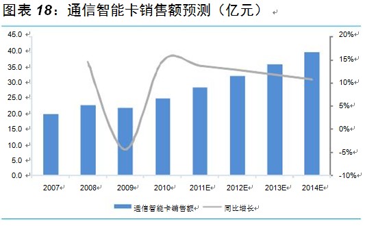随着3G用户大规模增长,高端大容量3G智能卡迎来了高速发展,通信智能卡均价将大幅提高,预计未来3年通信智能卡的销售额将保持13%左右的较快增长,至2014年年销售额有望达到40亿元。