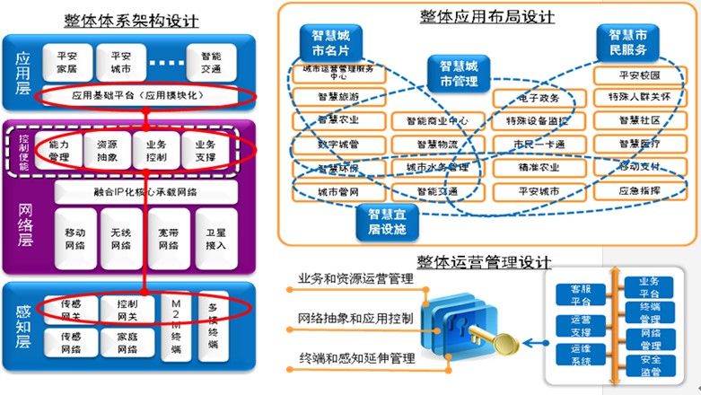 第一个层面是整体体系架构设计。主要是把整个网络中的智能处理、计算能力分布到三个层面上:包括感知层,网络层和应用层。通过三层的智能分布与相互关联,实现整个系统的能力均衡部署,构成一个明确的、标准的、面向未来可自由扩展的开放式的体系架构。并在此架构基础上提供一个弹性的业务环境——可以自由地添加、删除业务,业务之间可以联动和协同。
