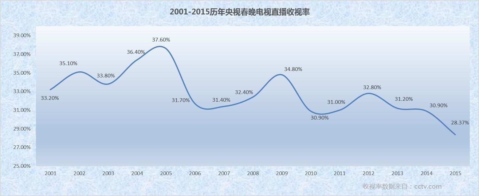 从表中我们可以发现,自2001年起至2014年,收视率基本都在32%上下波动,而近两年出现下滑,其中很重要的一个原因是由于视频网站同步直播的加入,用户可以在PC、手机或平板电脑的屏幕上同步观看直播节目,也可以错时回看或点播,从而造成了当晚电视收视的分流:据行业相关人士提供的数据显示,在春节长假七天中春晚节目在电视端重播收视率涨了3个点,网络点播收视率基本上是去年的5倍,而七天总体多屏总收视率比去年增长了5.44个百分点。