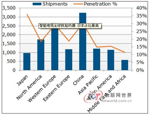 此外报告指出,2012年第一季智能电视占全球电视总出货量的20%,日本最高为36%,中国为30%,西欧智能电视的占比超过29%,北美为18%,全球所有地区智能电视渗透率均在10%以上。