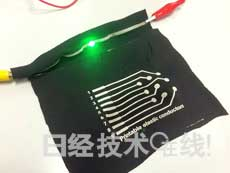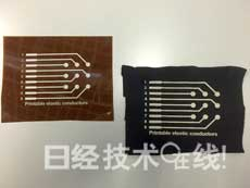 东京大学研究生院工学系研究科染谷隆夫教授的研究小组开发出了一次印刷便可在布料上形成微细电路图案的新型导电性油墨。其特点是,即使将布料长度拉伸至三倍,仍可保持高导电性。如果该技术实现实用化,就可以将弹性布料像印刷电路板那样使用。将来有望在运动服上印刷肌电传感器用于训练,或者印刷可以检测脉搏和脑波等人体信息的传感器,用于医疗和福祉用途。