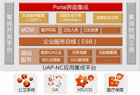 在国外有两类平台概念是相对分离的。有一类就是应用开发的平台,用友前十年研发UAP平台,最主要的定位也是在应用开发平台上。但是在医疗卫生行业中,应用集成的概念就变得非常的重要了,因为我们面临着几百种、上千个信息系统的这样一个系统集成的环境。完全用新系统去替换所有的老系统,这种可行性非常差。所以在UAP-H对应用集成平台方面比UAP进行了很大的增强,主要是要解决医疗卫生行业中各类系统的集成问题,这种集成包括了从界面、流程、业务到消息的集成,最后到角色的集成这个程度。