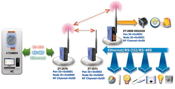 ZT-2570与ZT-2571系列模块支持RS-232、RS-485、Ethernet与ZigBee无线信号的转换。基于IEEE 802.15.4标准协议所设计,其通讯频率可调整介于2405MHz ~ 2480MHz之间,并固定划分为16个RF通讯频道,每个RF通讯频道的频率间隔5MHz;同时提供了16384个逻辑网络群组代码(Pan ID, 0x0000 ~ 0x3F00) 。泓格科技的ZT ZigBee系列产品的优势在于其低成本、低功耗,并遵循ZigBee联盟制订的通讯规范ZigBee 2007(ZigBee Pro);其中,一个ZigBee无线网络内只允许一台主机,该主机被称为”协调者” (Coordinator),即ZT-2550系列,其主要的作用为初始化以及路由路径管理;另外,一个ZigBee网络可支持255台ZigBee子机,其作用为传送、接收来自于父节点或是子节点的数据。