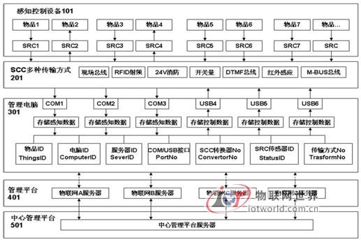 任何传感控制设备都会采用有线或无线传输方式,接收装置接收的数据都会转换成控制电脑或嵌入式设备可处理的TTL电平数据。我们把接收的传感控制设备的每条感知和控制数据存储到控制电脑中,当接收任何传感器如RFID的感知数据,将该数据与电脑存储数据进行比对,找出对应数据存储单元,解析出该感知信息,从而实现对各种传感器的感知信息识别。控制电脑可以模拟多种执行器的控制器,实现对物品的统一控制。
