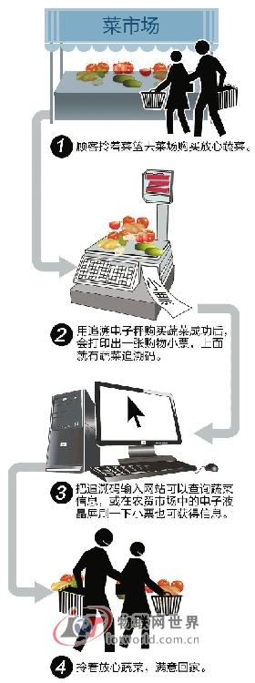 20位的“追溯码”相当于蔬菜的身份证号码。只要上网输入追溯码(网址www.apts.gov.cn),就会出现关于这批蔬菜一系列的生产、销售过程,而且随时都可以查。就像淘宝网交易成功后可以查看“物流动态”,实时关注快递到了哪里,由谁人经手。信息完全公开化,一目了然。