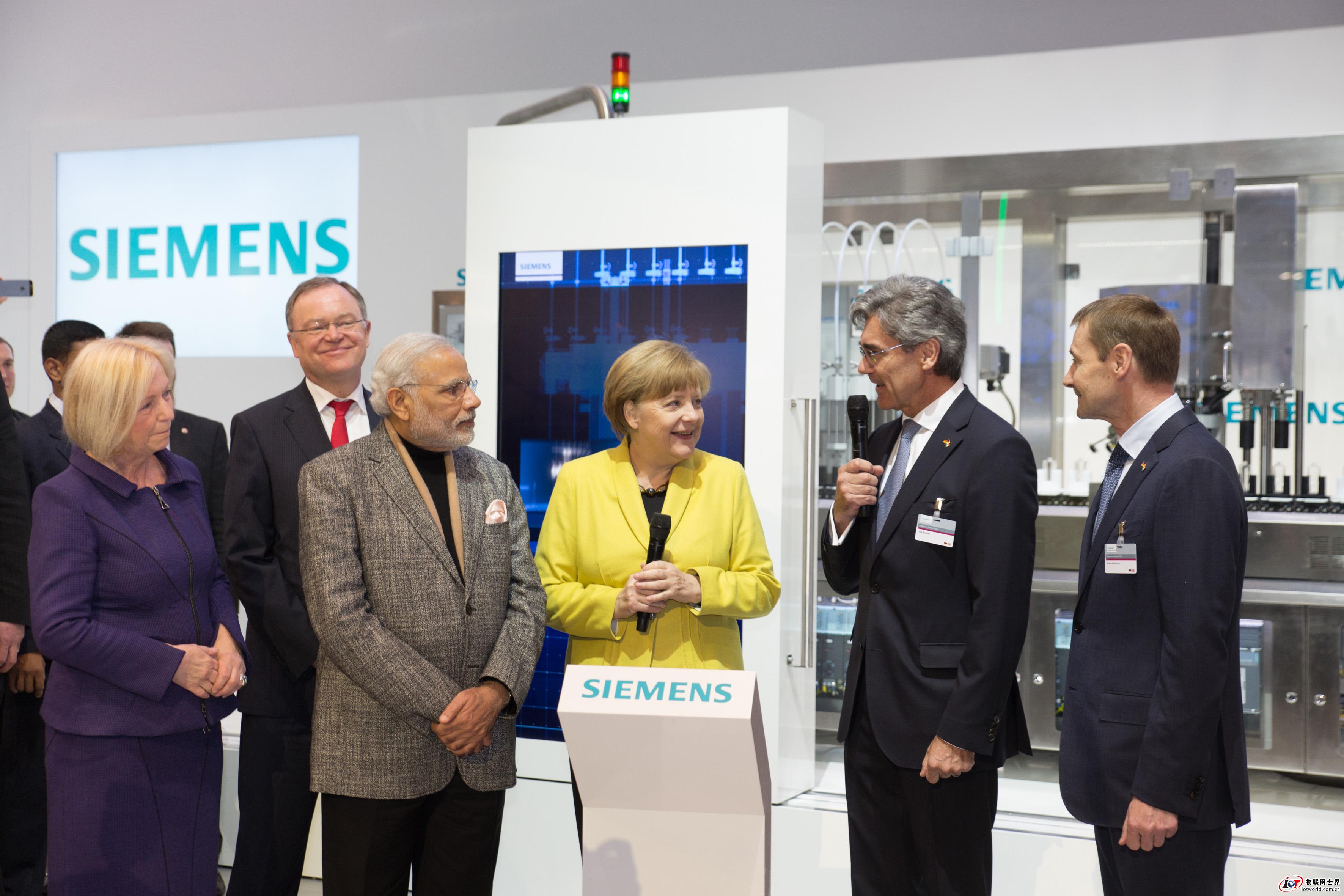 西门子股份公司总裁兼首席执行官凯飒向德国总理默克尔和印度总理莫迪介绍西门子展台