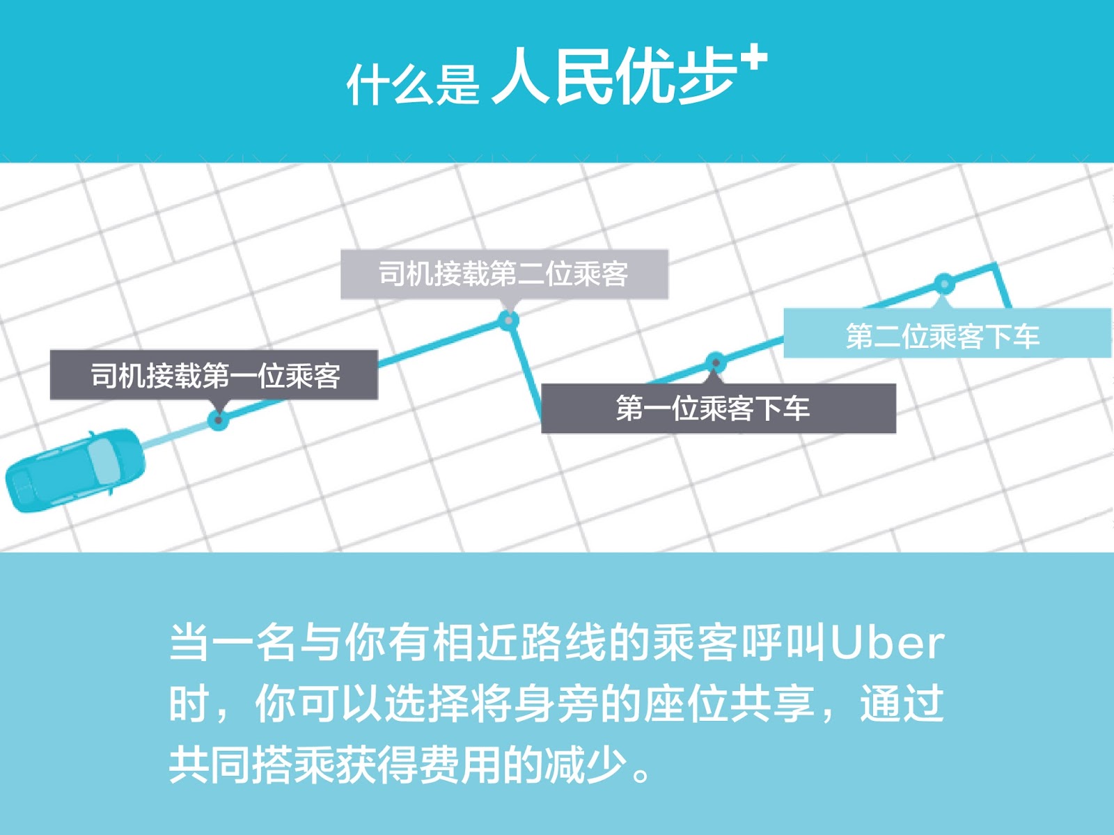 Uber表示,从2015年8月25日起,优步将于上海的部分地区内试行“人民优步+”新功能。届时,“人民优步+”将实现多人共乘。