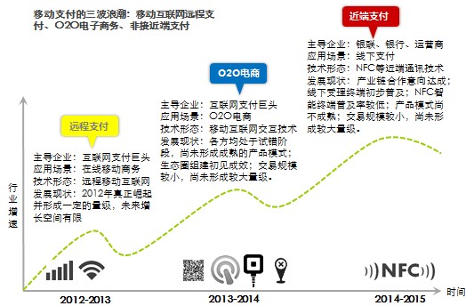 艾瑞咨询认为,判断未来几年将是移动支付产业取得突破式发展的关键时期,整体市场会迎来三个浪潮,一是移动互联网远程支付,即基于移动互联网把PC端照搬过来的模式;二是O2O电子商务支付,目前互联网支付巨头纷纷针对这一领域推出一些创新支付形态,如二维码,在经历一段市场调研之后,将会出现一些适合满足用户需求的产品形态,从而为移动支付产业带来一个短期的高速增长态势;三是非接近端支付,随着近场行业标准、受理环境、应用场景、应用内容等基础条件的逐步成熟,将会迎来市场的爆发式放量。