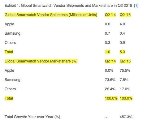 根据研究公司 Strategy Analytics 的最新数据,Apple Watch 在发布后的一个季度内,已经占有了全球智能手表市场的75.5%,排名第二的是三星,市场占有率为7.5%。Strategy Analytics 预测,2015年第二季度,苹果 Apple Watch 的销量为400万,而三星智能手表的销量为40万。