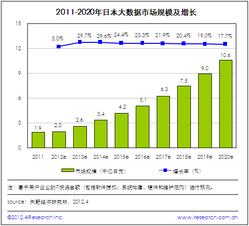 iResearch艾瑞咨询整理矢野经济研究所发布的最新数据发现,2020年日本大数据市场总额预计达到1万亿日元。2011年,包括软件授权、系统构建、硬件和维护在内的大数据市场总额为1900亿日元,预计2012年将实现5%的增长,之后的增长率将持续在20%左右。