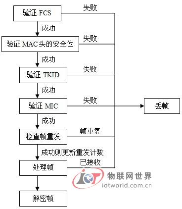 帧重发保护接收拥有有效的FCS和MIC的安全帧时,信息接收流程为:从接收帧中萃取出SFN,将其与此帧所用临时密钥的重发计一数器的值作比较。如果前者小于等于后者,接收者MAC子层丢弃此帧。MLME提交MLME-SECURITY-VIOLATION,它的ViolationCode设为REPLAYED_RAME。否则,接收者将接收到的SFN赋给相应的重发计数器。不过,使用此SFN更新重发计数器前,接收者应确保此帧已通过FCS验证,重发预防和MIC确认。