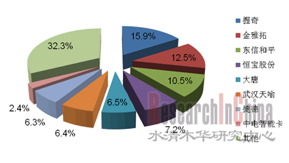2010年中国智能卡市场中,握奇数据智能卡销售收入接近13亿元,占15.9%的份额;金雅拓销售收入约10.15亿元,占12.5%;东信和平和恒宝股份智能卡销售收入分别为8.52亿元和5.81亿元,分别占10.5%和7.2%。