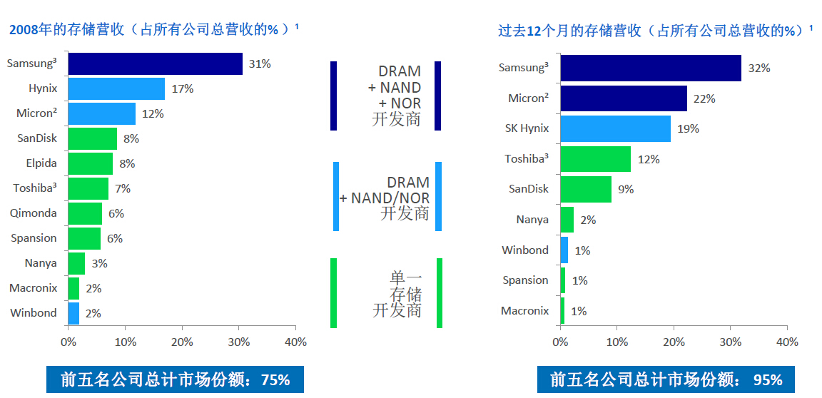 当然,中国发展存储产业并不容易。目前全球存储业已经进入高度垄断时代。根据美光公司提供的一组数据,2008年全球前五大存储芯片公司,包括三星、海力士、美光、闪迪、尔必达,总营收为整个市场的75%。而过去12个月(美光2013年第三财季至2014年第二财季),全球前五大存储芯片公司,包括三星、美光、SK海力士、东芝、闪迪,总营收已占整个市场的95%。在DRAM产业方面,三星、SK海力士、美光纷纷抢进20纳米制程世代,业界原本预期20纳米制程是DRAM产业最后一个制程世代,目前各家DRAM大厂又在积极投入研发1x纳米制程,希望能够突破瓶颈。在这样的背景之下,包括京东方在内的中国企业进入这个竞争激烈的存储产业并不容易。