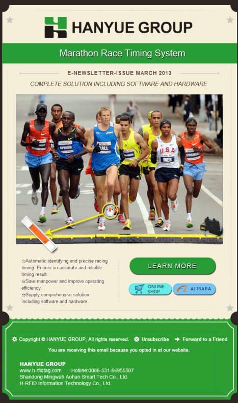 山东明华澳汉智能科技有限公司的RFID电子标签被应用于马拉松赛事。据介绍,将RFID应用于马拉松的精确计时,运动员在携带上系上RFID电子标签,在起跑线和终点还有在线路中处放置读写装置,当运动员经过读写装置时,将会读取鞋带上的RFID电子标签的ID,记录当时的时间,软件系统会处理和显示信息。这样,就可以准确可靠的记录起跑和终点的时间还有在比赛中间的时间和各种情况,节省了人力资源,也保障了比赛的公正性与准确的运动员成绩。同样,也可以应用于长跑、竞走、或自行车等比赛项目还有平时运动员的训练。