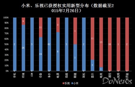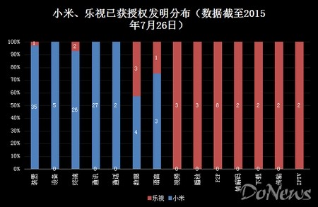 截止2015年7月26日,小米已累计获得的专利授权中,包括:54件发明专利、134件实用新型专利和122件外观设计专利。而乐视已累计获得专利授权中,包括25件发明专利、64件实用新型专利和240件外观设计专利。