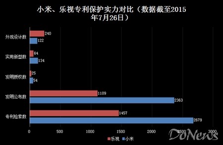 截止2015年7月26日,小米已提交申请未授权的发明专利申请共计2679件,乐视已提交申请未授权的发明专利申请共计1457件。