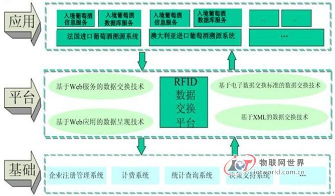 基于物联网技术的进口葡萄酒溯源平台的总体架构如上图所示分为三层,即基础层、平台层和应用层。基础层包括企业注册管理系统、计费系统、统计查询系统和决策支持系统等,这些系统是葡萄酒溯源管理平台的基础,用于对进口葡萄酒的所属企业信息的管理、货物的计费、货物的统计查询以及对企业进行决策支持等;应用层包括对进口葡萄酒的溯源管理系统等,主要用于对进口葡萄酒的信息服务、进口葡萄酒的安全追溯、进口葡萄酒的数据库的管理等;平台层是基础层和应用层信息交换的纽带,原产地溯源平台的平台层主要包括一些数据交换技术,包括基于Web服务的数据交换技术和基于电子交换标准的数据交换技术等,这些技术使平台层和应用层进行很好的数据交换。