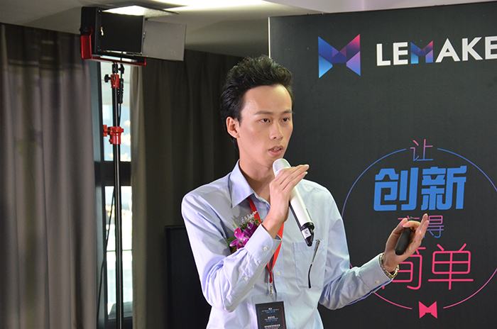 图为:LeMaker科技联合创始人张腾先生做新品介绍