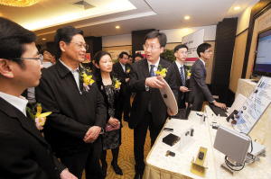 佛山天一众合负责人向市委书记陈云贤(左二)介绍城域物联网应用工程各种智能产品。/本报记者孙海庆摄