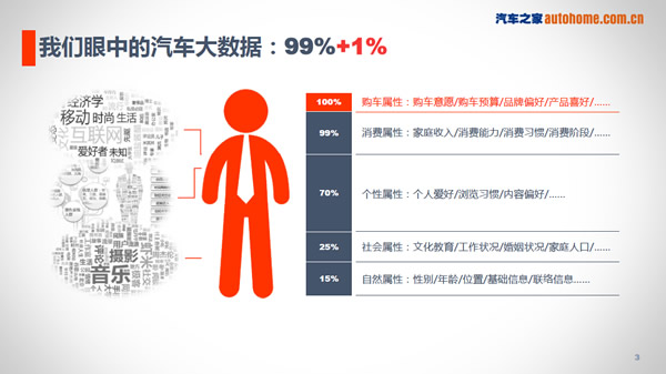 在座的应该都在网上买过东西,这些网站完全把各位的消费习惯进行记录分类,以便于定义收入状况和消费能力。这些加起来是99%,为什么这么说?作为汽车行业而言,这一切都是给目标消费群一个模糊的匹配,一个用户可能偏好什么?他的习惯可能如何如何?这里面始终差了最后一部分数据,这部分数据量其实并不大,但是这部分数据对主机厂来说最有价值,这是汽车之家提供的购车属性。