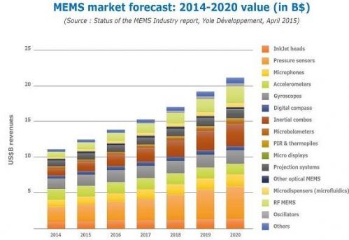 根据Yole的统计资料,2014年全球MEMS传感器市场产值约111亿美元;该公司并预测,这一市场将在2020年时达到300亿台的出货量,市场规模约有200亿美元。