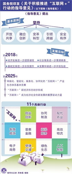创业创新、协同制造、现代农业、智慧能源、普惠金融、益民服务……《国务院关于积极推进“互联网+”行动的指导意见》4日发布,明确了11项重点行动和7方面保障支撑措施,提出了发展目标。此举意味着中国全面开启通往“互联网+”时代的奇幻大门。