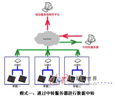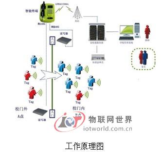 学生携带2.4G有源标签出入校门口时,就被安装在校门口处的读卡器自动读取。(校门口安装两个读卡器,通过读卡器的ID号先后顺序来判断学生的出入)读卡器把读到的信息传给信息处理终端进行处理,再把处理后的信息传给校讯通终端。校讯通终端再把信息发给移动平台,在经过学校后台服务器。最后移动平台把信息发给所对应家长的手机。