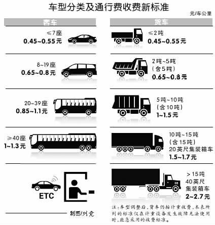 注:车型调整后,货车仍按计重收费,本表所列的标准仅在计重设备发生故障无法使用时,应急采用的收费标准。