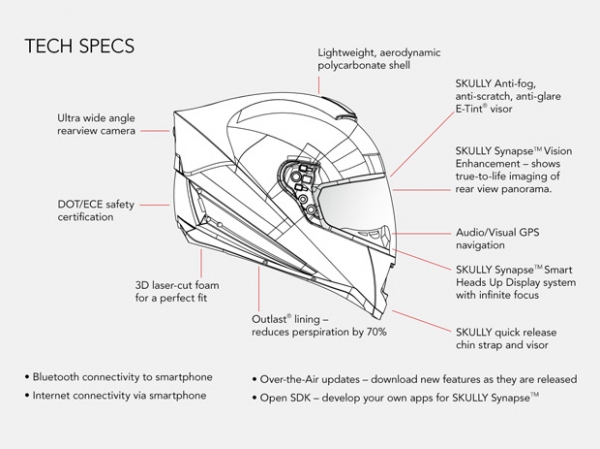 Skully AR-1 摩托头盔的抬头显示信息整合自头盔内部的传感器、微处理器以及摄像头,另外附带分段行进式导航功能,能够在距离车手约3米远的位置播报建议路线,SKULLY 把这个称为Synapse(神经突触)系统。此外,这套系统采用了自动无级变焦显示技术,这意味着无论车手以什么角度观察,地图在头盔上的呈现都是最清晰的。自然,所有的这些技术都是为了确保驾驶者将注意力放在路上的行驶车辆,而不是路牌路标之类的东西。考虑到这一点,SKULLY 团队还为头盔开发了后视系统。AR-1的后视系统的功能类似于汽车的倒车影像,不过AR-1的后视摄像头是实时无死角全景式捕捉,拍摄的影像就显示在抬头信息的正下方,易于观察。韦勒介绍说,这项技术能让驾驶者轻松又清楚地了解背后的环境,消除视觉盲点,安全并线。这款头盔通过蓝牙与智能手机连接,续航能力达到了9个小时。韦勒认为,这应该是摩托车手(合理的)连续行驶的极限时间了。