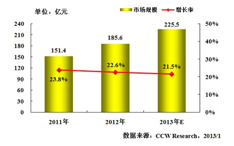 《2013年中国医卫行业信息化建设与IT应用趋势研究报告》的研究结果显示,2012年中国医卫行业IT投入达185.6亿元,较2011年同比增长22.6%;2013年医卫行业信息化建设投入将继续保持理性状态,呈现平稳增长趋势。2013年中国医卫行业的IT投资规模约为225.5亿元人民币,较2012年同比增长21.5%。如下图所示。