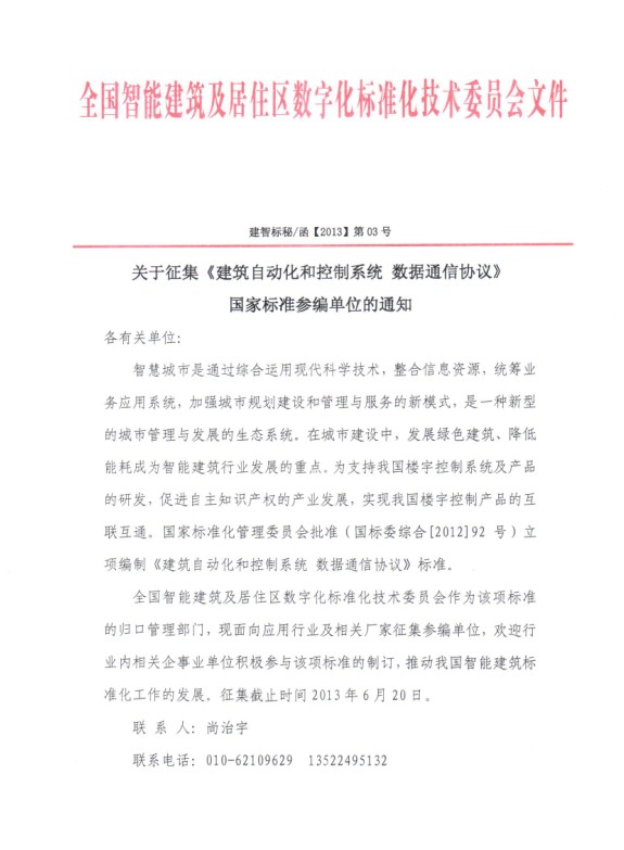 全国智能建筑及居住区数字化标准化技术委员会作为《建筑自动化和控制系统 数据通信协议》标准的归口管理部门,现面向应用行业及相关厂家征集参编单位,欢迎行业内相关企事业单位积极参与该项标准的制订,推动我国智能建筑标准化工作的发展,征集截止时间为2013年6月20日。