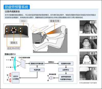 防疲劳预警系统是比亚迪的又一力作,汽车安全技术再升级。该"防疲劳预警系统"是基于驾驶员生理图像反应,利用驾驶员的面部特征、眼部信号、头部运动性等推断驾驶员的疲劳状态,并进行提示报警和采取相应措施的装置。同时具备对环境的强抗干扰能力,对车主行车安全给予主动智能的安全保障。