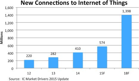 IC Insights还注意到,现在接入到互联网的“物”的数量,远远超过新增互联网人口,预计2015年新增的物联网接入设备将达到5.74亿个,同比增长40%,这些物联网接入设备包括嵌入式系统、传感器、仪器、汽车、控制器、摄像头、可穿戴产品及其他。2013年新增2.82亿个物联网接入设备,2014年新增物联网接入设备数达到4.1亿,同比增长45%。
