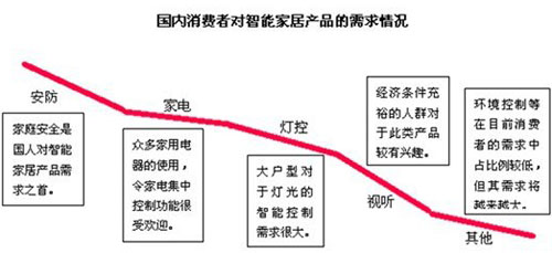 而在国内据调查,消费者对家庭安全的需求是最大的,而后依次是家电控制、灯光、视听等功能。国人对于娱乐智能方面的需求相对较弱,而对于家庭安全却是非常重视的。