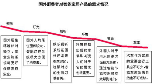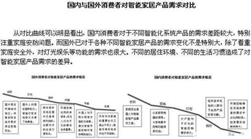 从对比曲线可以明显看出,国内消费者对于不同智能化系统产品的需求差距较大,特别注重家庭安防问题。而国外已对于各种不同智能家居产品的需求变化不是特别大,除了看重家庭安全外,对灯光娱乐等功能的需求也很大。不同的居住环境、不同的生活习惯造成了对智能家居产品需求的差异。